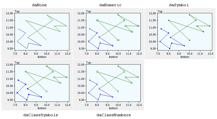 Any data point in a graph may be displayed using one of the following attributes which are displayed on top of the base graph. The plot parameter DataAttrib controls these attributes and can assume one of the following values: