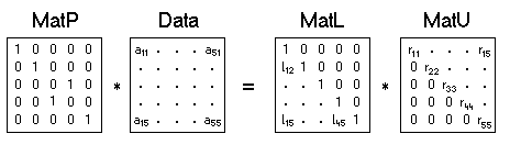 The function LUPDecomposition decomposes the square matrix Data into two triangular matrices MatL and MatU and the permutation matrix MatP, with the matrix MatL being the lower triangular matrix (containing all 1s in the diagonal), and MatU the upper triangular matrix. The variable parameter NumPerm returns the number of exchanged rows.